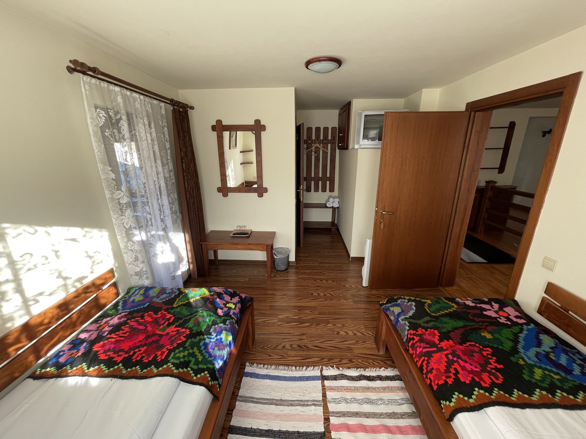 Cameră dublă compusă din dormitor și baie proprie cu un duș.